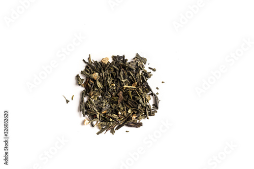 different sorts of black or green tea in bulk on a white background close-up isolated