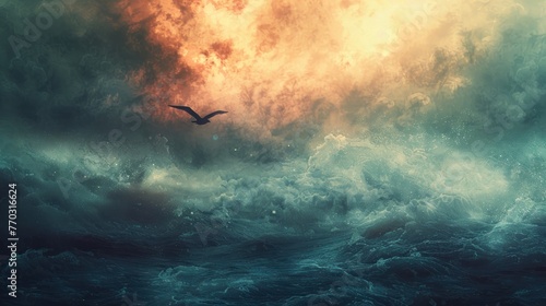 Digital art of a powerful ocean storm with a solitary bird flying against a fiery cloud backdrop, evoking a sense of freedom and wildness.