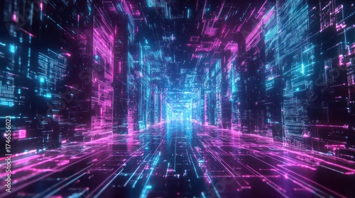 Digital city tunnel with vibrant neon lines