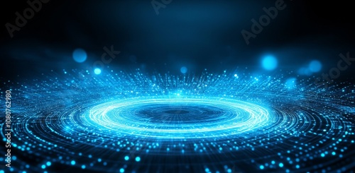 Digital data is represented on an orbit with a hi-tech HUD and particles moving forward in future technology of communication in a modern illustration.
