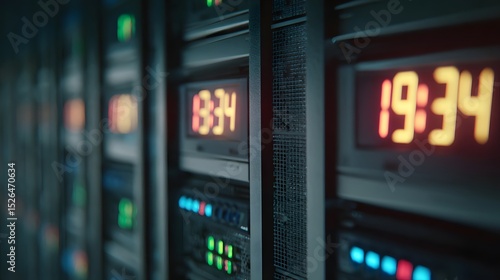 Digital display panels showing time in a server room, highlighting technology and data management