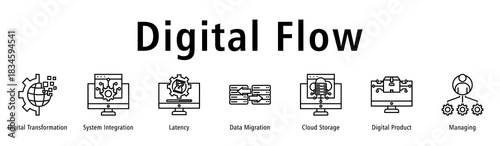 Digital Flow web banner icon vector illustration with icons of Digital Transformation, System Integration, Latency, Data Migration, Cloud Storage, Digital Product and Managing.