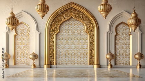 Digital illustration depicting an ornate architectural detail. The image showcases a large, golden arabesque archway set against a white marble wall.
