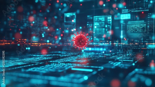 Digital Illustration of a Red Virus with Intricate Details on a Computer Screen Symbolizing Cybersecurity Threats and Digital Health Concerns Worldwide