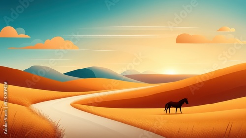 Digital illustration showcasing a solitary horse standing in golden fields with a winding path under a setting sun, creating a tranquil and picturesque landscape scene.