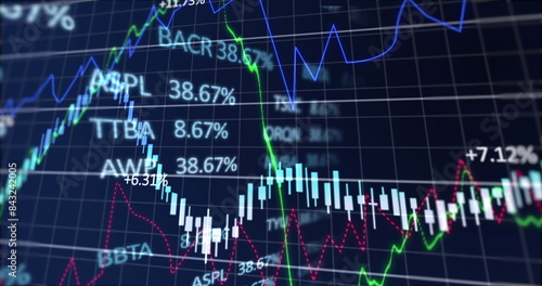 Digital image of financial and stock market data processing against blue background