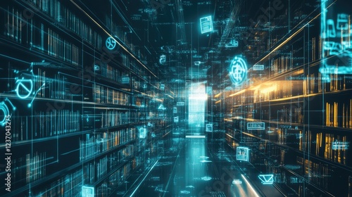 Digital Library Corridor Illuminated With Data Streams