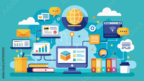 Digital network connecting computers and data with cloud and communication icons