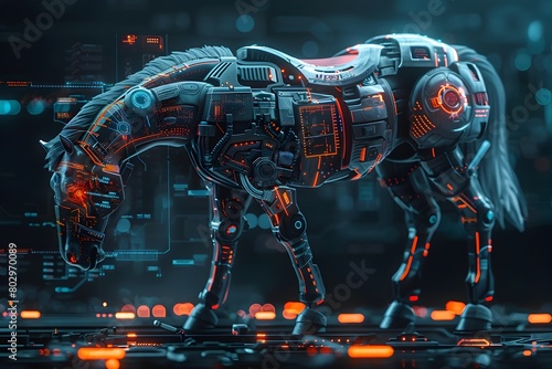 Digital of Equine-Machine Chimera Analyzing Holographic Schematics in Moody,Bioluminescent Environment