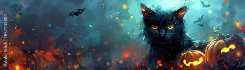 Digital painting of a black cat with glowing eyes, surrounded by holographic pumpkins and eerie light effects