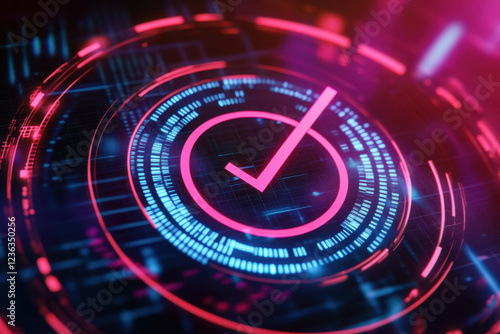 Digital radar detecting threats with glowing check mark symbolizing security and verification. vibrant colors and futuristic design evoke sense of advanced technology and safety