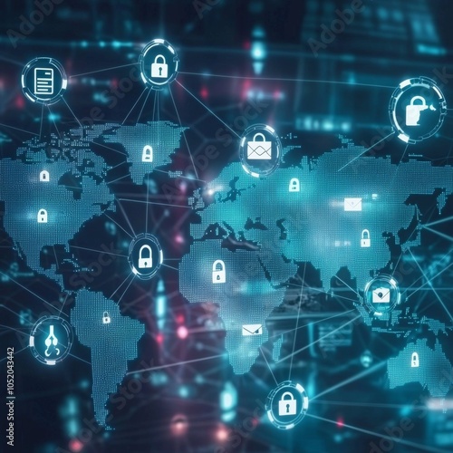 Digital world map with international cyber security icons overlayed