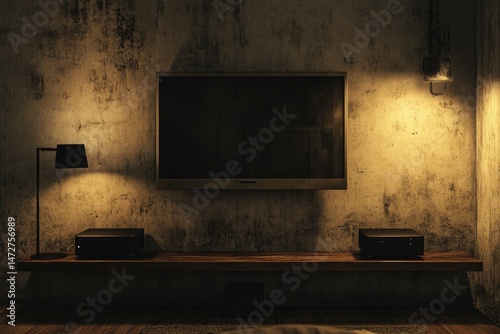 Dimly lit entertainment center in a rustic room