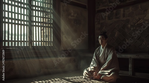 dimly lit room where the Goryeo dynasty is locked up, guarded by soldiers. The young king is sitting on a simple wooden chair, with bars on the windows casting shadows on his face,