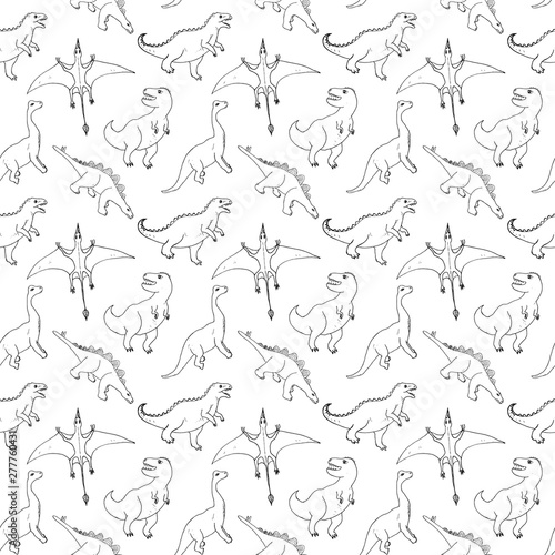 Dino Seamless Pattern, Cute Cartoon Hand Drawn Dinosaurs Doodles Vector Illustration