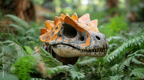 Dinosaur figure peeks through vibrant ferns in a rich, green landscape