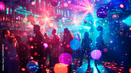Disco party with people dancing in nightclub neon lights and mirror ball.
