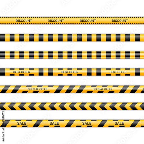 Discount lines and best and special offer ribbons. Sale tapes in yellow and black color. Warning signs collection isolated on white background. Vector illustration
