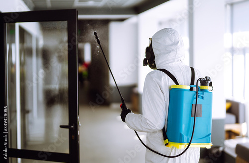 Disinfecting of office to prevent COVID-19, Man in protective hazmat suit with with spray chemicals to preventing the spread of coronavirus, pandemic in quarantine city. Cleaning concept.