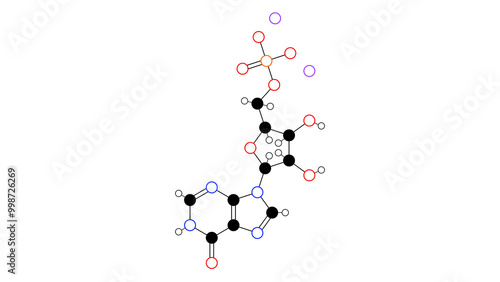 disodium inosinate molecule, structural chemical formula, ball-and-stick model, isolated image e631