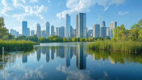 Distant view of a contemporary city skyline with tall buildings and water reflections, the scene capturing the balance of nature and modern architecture