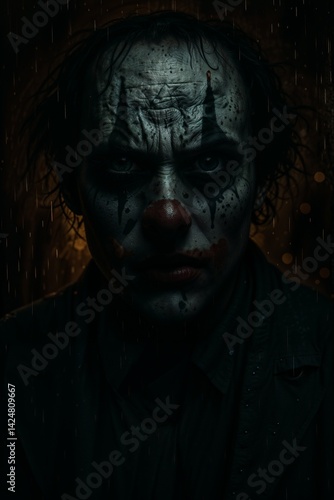 Disturbing Portrait of a Grungy Clown in the Rain