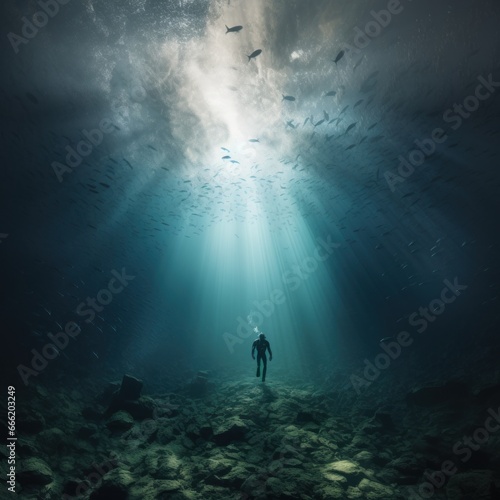Divers are on cliffs and sea troughs adventuring on the seabed in the morning and evening with the beauty of natural rocks and coral moss, good for business, marine, blogs, websites etc. Generative Ai