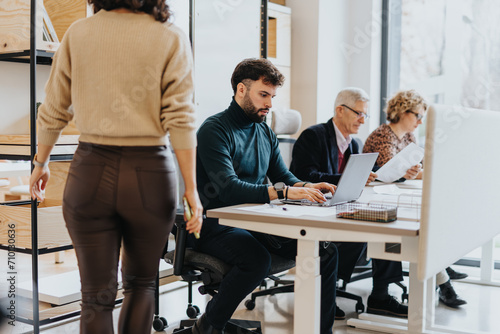 Diverse businesspeople collaborate in a modern office, discussing project solutions and working together on tasks. Happy and successful teamwork.