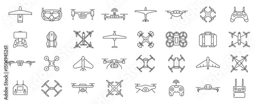 Diverse Collection of Drone Designs and Remote Control Icons in Outline Style