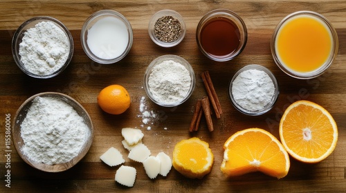 Diverse Cooking Ingredients Displayed on Wooden Surface for Culinary Preparation and Recipe Creation