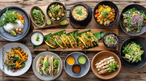 Diverse Delicious International Cuisine Flatlay Asian Fusion Tacos Rice Bowls Salads