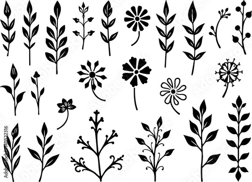 Diverse floral elements feature leaves and flowers in a black and white design Use it to create unique botanical designs.