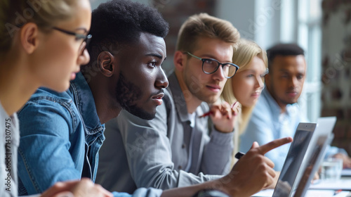 Diverse group of four young professionals or friends, gathered around a laptop at a modern workspace, collaborating or discussing