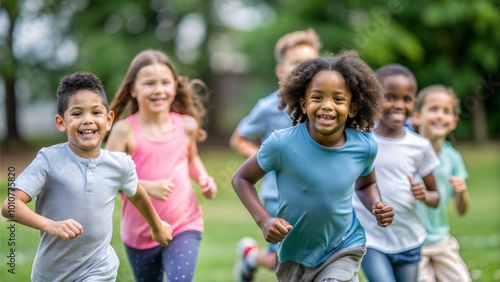 Diverse Group of Kids Running in Park for Outdoor Fun Activity