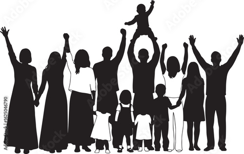Diverse group of people with raised arms celebrating, group, people, family, celebration, diversity, unity, teamwork, success, joy, happiness, freedom, protest, activism, community, togetherness, arms