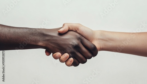 Diverse Hands United: Abstract Multicultural Handshake on White Background. Symbolic Representation of Unity, Inclusion, and Global Cooperation. Ideal for Diversity Campaigns, Social Equality Messagin