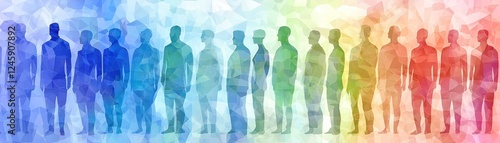 Diverse people standing together, rainbow background, unity concept