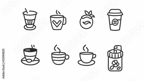 Diverse Set of Coffee - Centric Icons: Teas, Drinks, Cocoa, Cups, and Cafe Scenes