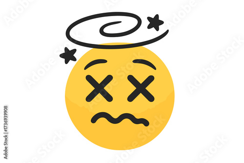 Dizzy emoticon face vector icon. Emoji with crossed X eyes and seeing stars. Concept of knockout, KO, dead, mind blown, confused, sick, headache, vertigo, or unwell.