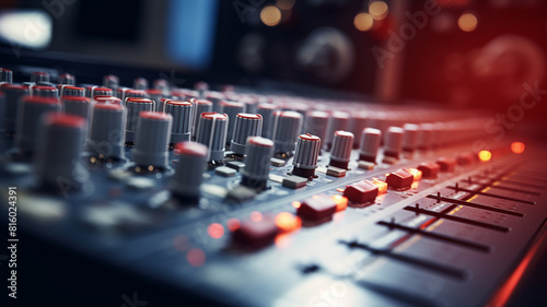 DJ studio sound console for mixing tracks and processing sounds.