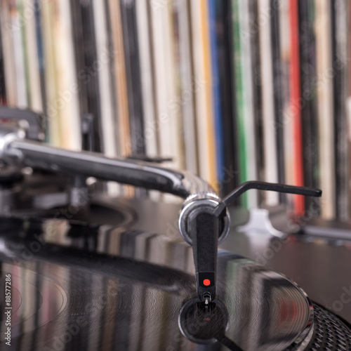 Dj stylus on spinning vinyl, record background