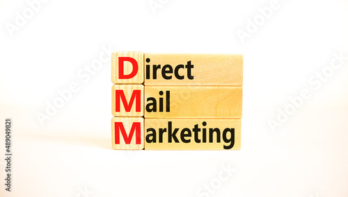 DMM direct mail marketing symbol. Concept words DMM direct mail marketing on wooden blocks on a beautiful white table, white background. Business and DMM direct mail marketing concept. Copy space.