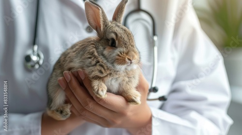 Doctor in a veterinary clinic holding a small rabbit during a medical checkup, demonstrating compassion and expertise. Veterinarian doctor holding cute animal