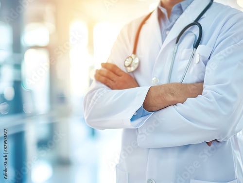 Doctor in uniform holding stethoscope and crossed arms. Hospital or clinic background and copy space