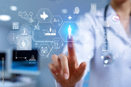 Doctor interacting with a digital interface. Healthcare technology integrating data and visualizing medical information for accurate diagnosis