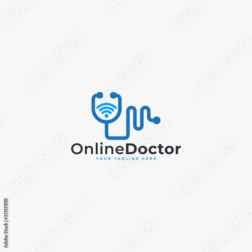 Doctor online virtual services logo design vector. Consultation to doctors via digital remote illustration symbol. Telemedicine service vector logo. Stethoscope and signal vector icons.