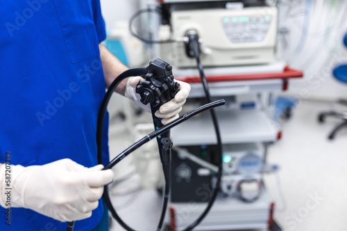 Doctor proctologist holding endoscope during colonoscopy. Probe colonoscope. Doctor gastroenterologist with probe to perform gastroscopy and colonoscopy