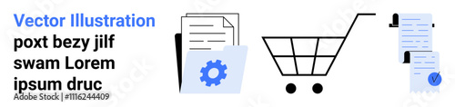 Documents, gear icon, and shopping cart illustrate digital business processes. Ideal for ecommerce, workflow management, document handling, online shopping, business automation, tech solutions