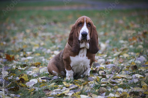 Dog of the Basset Hound breed sits in fallen leaves in nature.
