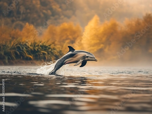 Dolphin leaping for autumn river, misty dawn.